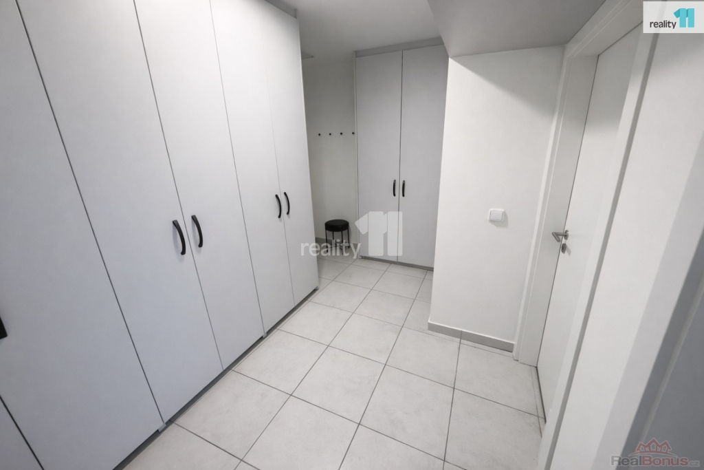Byt je dispozičně řešen jako 2kk a působí světlým, moderním a velmi praktickým dojmem. Už při vstupu vás přivítá prostorná předsíň s vestavěnými skříněmi na míru, které poskytují dostatek úložných prostor a podtrhují čistý, uspořádaný charakter interiéru. Z předsíně je přímý vstup do koupelny s WC, vybavené vanou, umyvadlem a šikovně řešeným koutem pro pračku a sušičku.