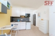 V bytě je bílá moderní kuchyňská linka vybavená spotřebiči, jídelní stůl, jídelní židle, pracovní stůl, pracovní židle, sklopná postel, úložné prostory, drobné vybavení, jak je základní nádobí, závěsy, lůžkoviny a povlečení a další. Je zde také koupelna se sprchovým koutem.