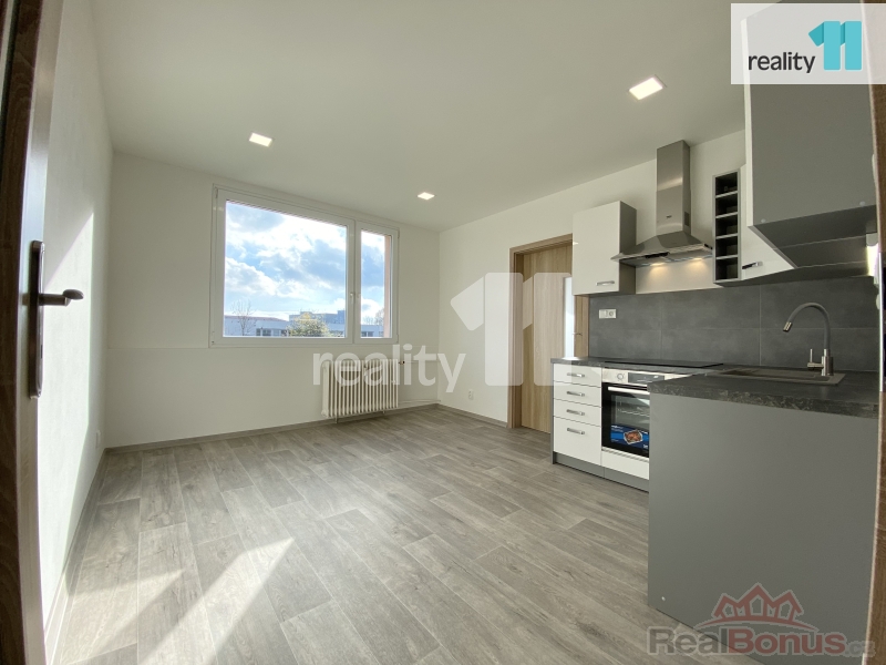 Dispozice a vybavení: vstupní chodba oddělena příčkou a dveřmi, kuchyň s obývacím pokojem, ložnice, zděná koupelna se sprchovým koutem, závěsná skřínka s umyvadlem, závěsné WC. Nová moderní kuchyňská linka do L vybavena vestavěným spotřebiči - vestavná trouba, komínový odsavač par, sklokeramická deska a myčka na nádobí. Příjemné prostředí v bytě vytvářejí snížené stropy s bodovými světly v kuchyni, koupelně a na chodbě.