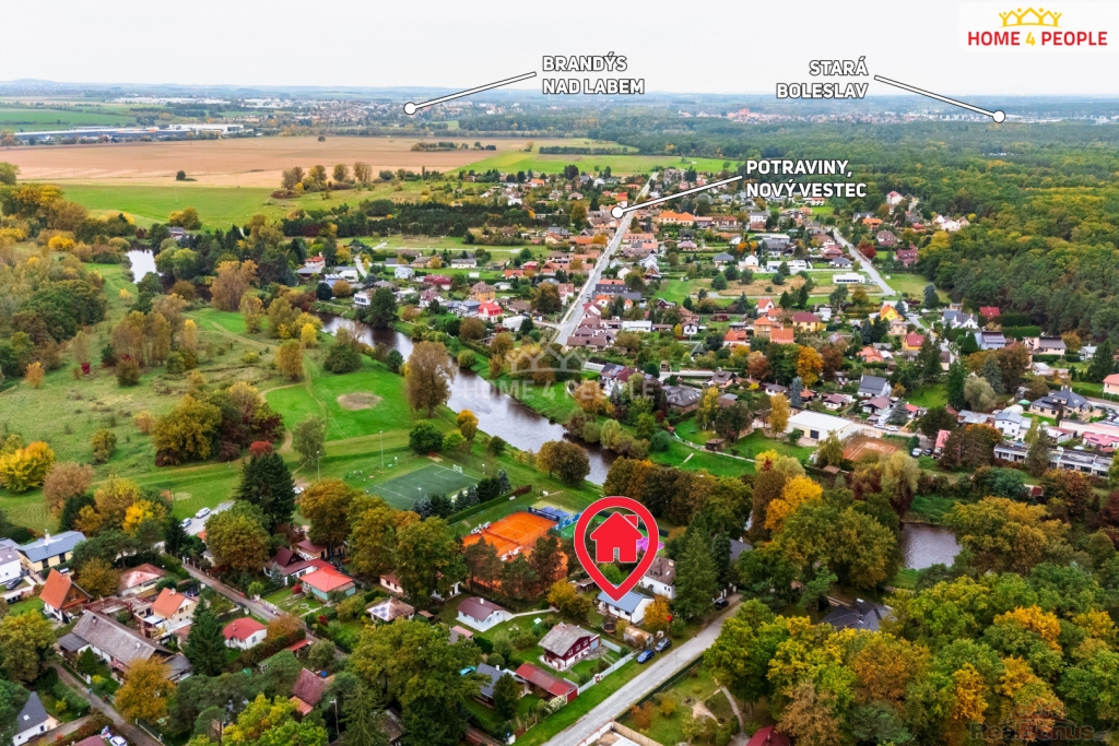 Dům se nachází v klidné lokalitě obce Káraný v těsné blízkosti řeky Jizery, ale není v záplavové zóně. Perfektní dojezdová vzdálenost do Prahy, 20 min. autem na Černý Most. Do Brandýsa nad Labem je to pouhých 10 min. autem a autobus č. 666 jezdí každou hodinu. V obci se nachází mateřská školka, tato lokalita vhodná pro mladé rodiny s dětmi.
