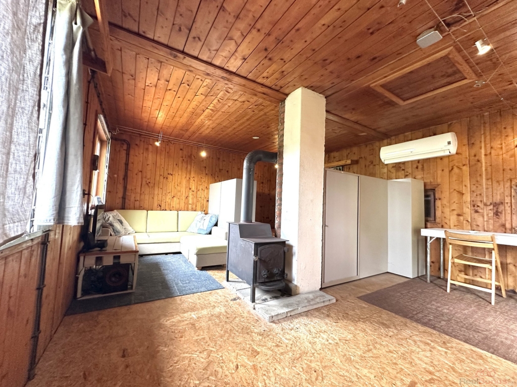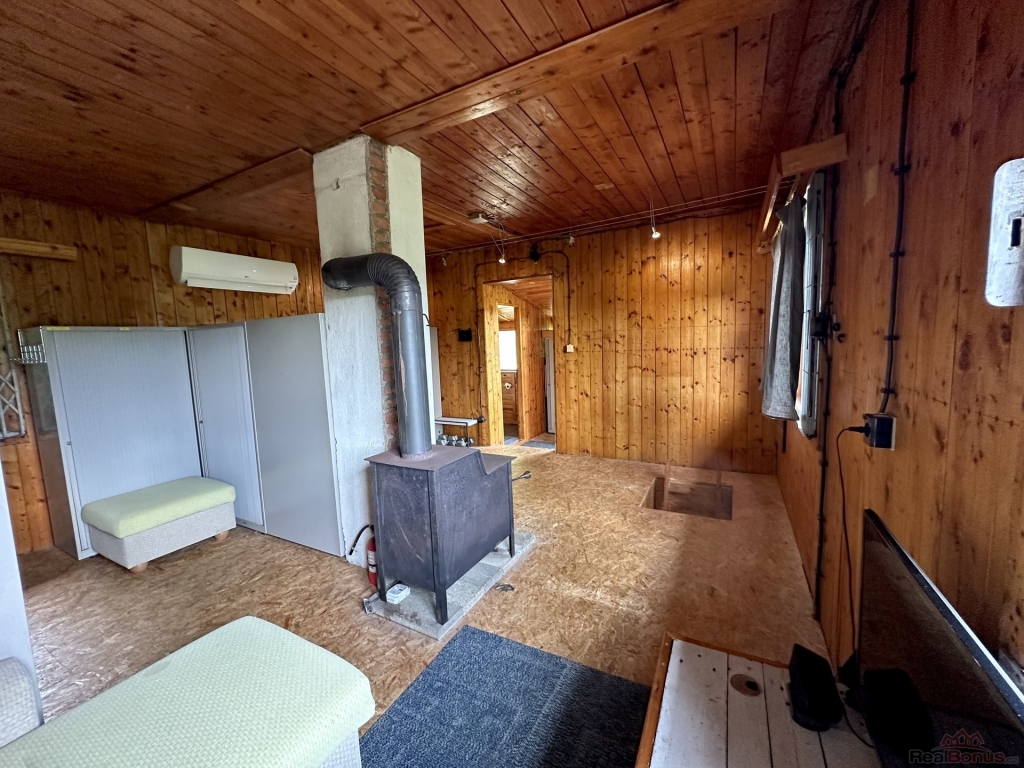 Udržovaná dřevěná chata je patrová, postavena na kamenné podezdívce na svažitém pozemku. V obytné části je velký pokoj s terasou a krásným výhledem do okolí (situováno na východ), koupelna se sprchovým koutem a WC. Dřevěná okna s jednoduchým sklem. K vytápění v chladnějším počasí jsou používána litinová kamna, jinak je možné využít tepelné čerpadlo-vzduch/vzduch i jako klimatizace. Do přízemí je samostatný venkovní vstup, nebo vnitřním dřevěným spojovacím schodišťovým žebříkem z hlavní místnosti. V přízemí je umístěná kuchyň a technická místnost s bojlerem na ohřev vody, přípojka na pračku. Rozvod vody je v plastu. Objekt má evidenční číslo a je napojen na elektřinu 230 i 380V, pitná voda je dovedena čerpadlem z vrtané studny, odpad sveden do jímky.