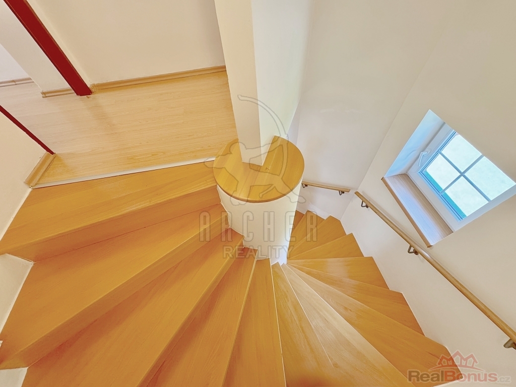 Tento mezonet má tři chytře řešená podlaží, propojená elegantním točitým schodištěm s masivními bukovými schody.
