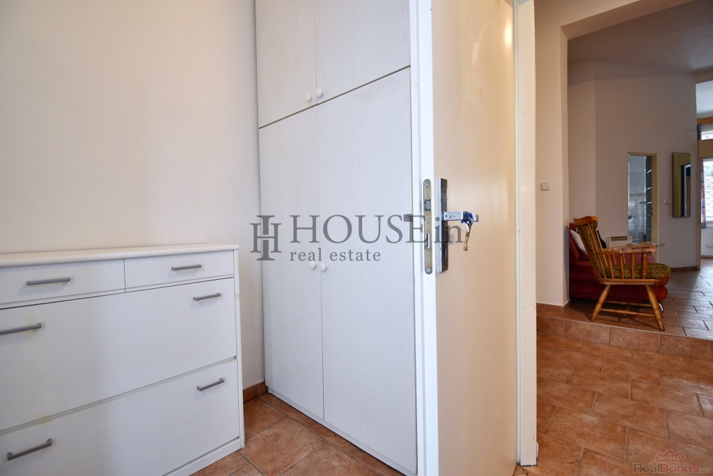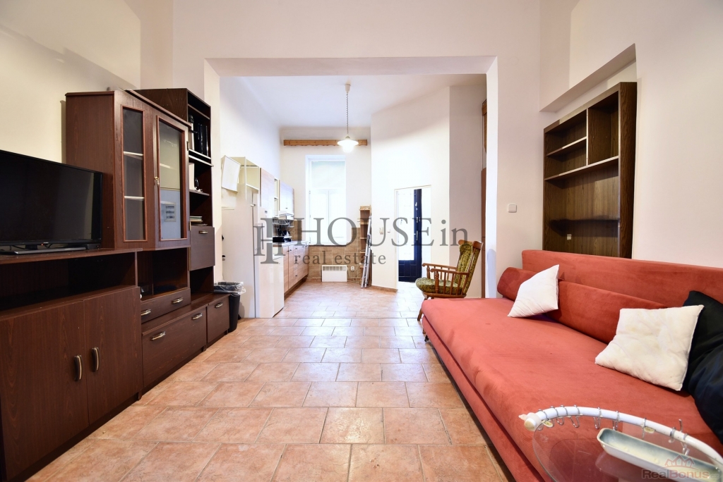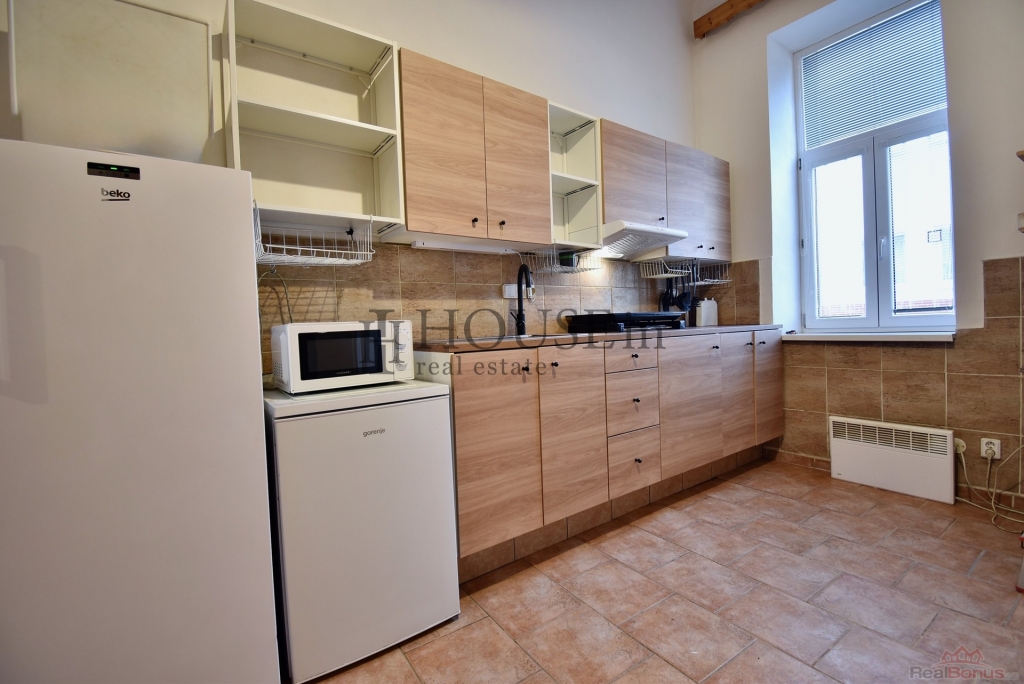 Byt má praktickou dispozici: předsíň se skříní, hlavní obytný prostor s kuchyňskou linkou, samostatnou ložnici a koupelnu se sprchovým koutem. Vstup do bytu je přímo z ulice. Byt se pronajímá částečně zařízený ? k dispozici je kuchyňská linka, lednice s mrazákem, indukční vařič, digestoř, pračka, TV, sedačka, obývací stěna a skříně.