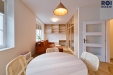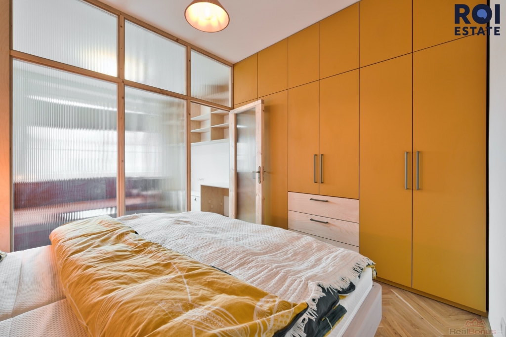 ? ložnice oddělená elegantní skleněnou příčkou, vybavená manželskou postelí a vestavěnými skříněmi