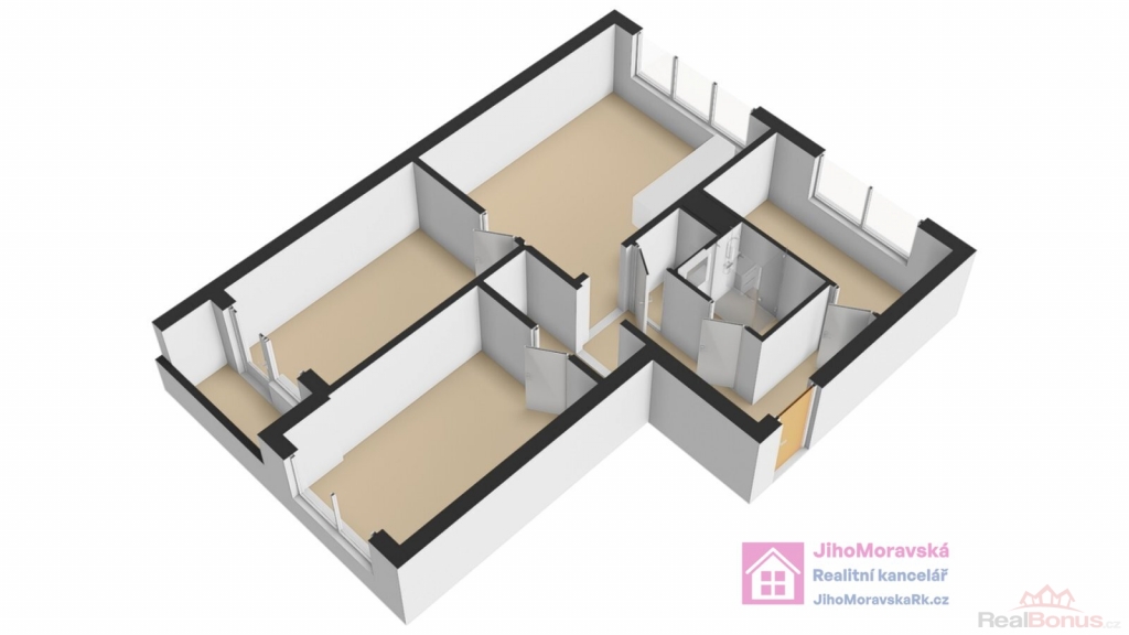 Dispozice bytu: předsíň, pokoj, chodba, koupelna (sprchový kout, připojení na pračku), toaleta, pokoj, pokoj s kuchyňským koutem, pokoj a lodžie. Půdorys bytu naleznete ve fotogalerii.