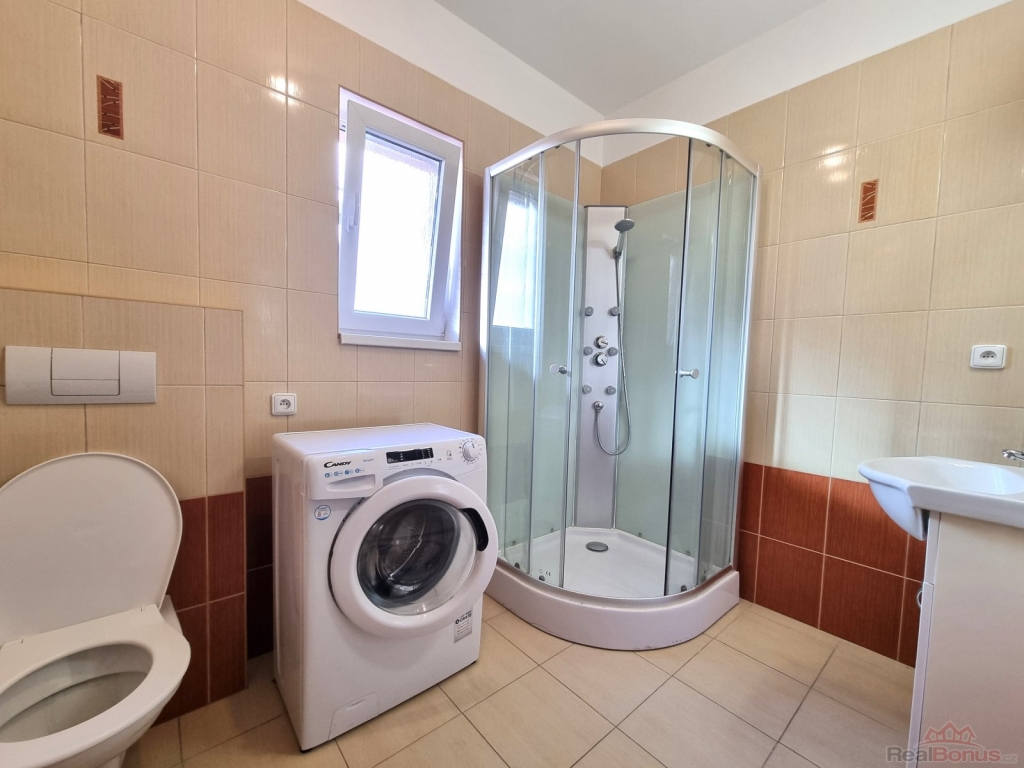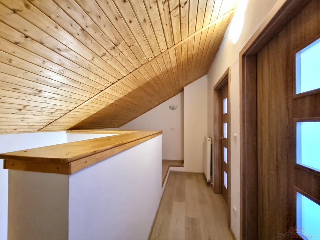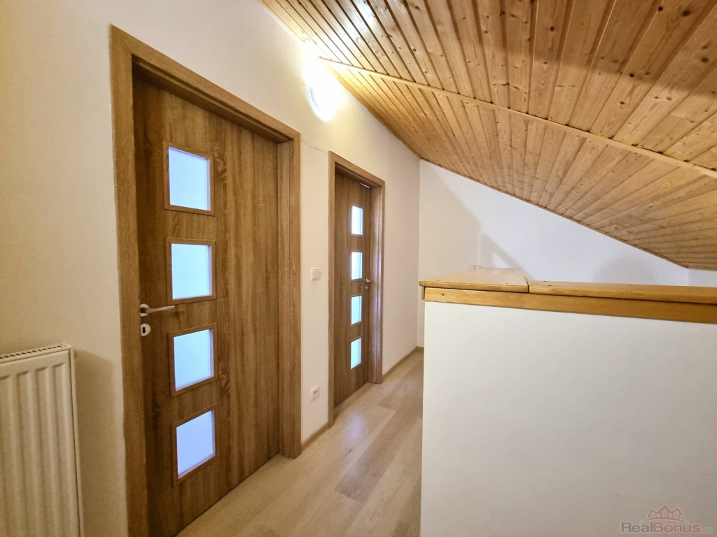V přízemí domu se nachází obývací část s kuchyňským koutem, koupelna a toaleta. Do patra vede dřevěné schodiště, kde jsou umístěny dva útulné pokoje. Součástí pronájmu je také zastřešená terasa o ploše 11,5 m, ideální pro relaxaci. Byt se pronajímá včetně kompletního vybavení.