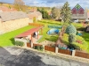 K bytu náleží již zmíněná dvougaráž o ploše 51 m2, situovaná ve sklepní prostorách domu. Ve vnitrobloku najdeme již zmíněnou zahrádku o rozloze 152 m2, jejíž součásti je bazén a pergola s posezením. Parkování je možné také na silnici přímo před domem.