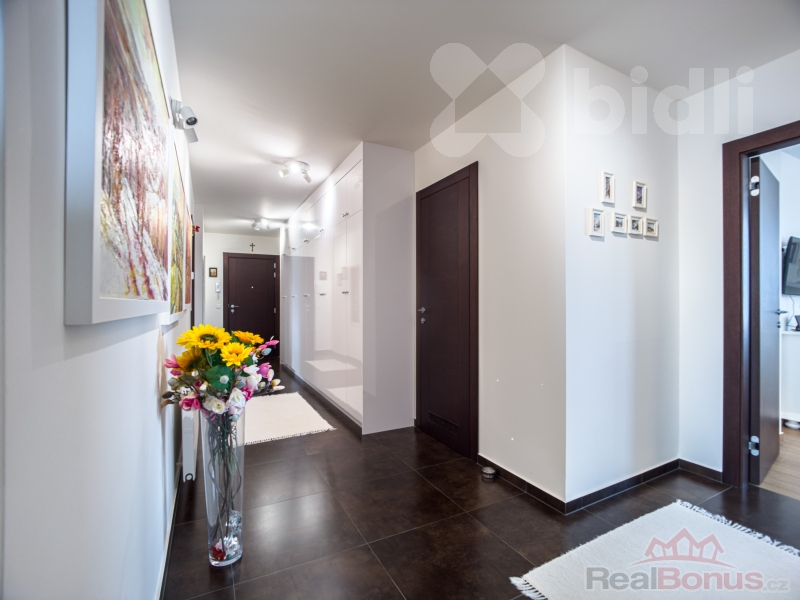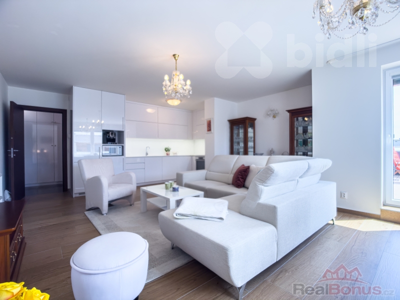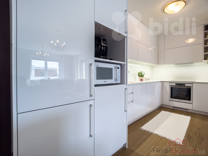 Interiér bytu je světlý, vzdušný a vkusně zařízený. Součástí vybavení je kvalitní kuchyňská linka na míru včetně vestavěných spotřebičů a praktické úložné prostory v podobě vestavěných skříní. Dispozice bytu je velmi dobře řešena - nabízí komfortní obývací část s kuchyní, dvě ložnice, moderní koupelnu, 2x WC a dostatek úložného prostoru.