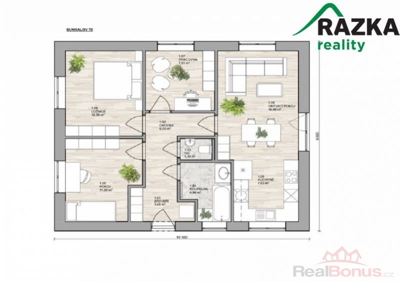 Předmětem prodeje je zděný RD o dispozici 4+kk s valbovou střechou, energetická náročnost třídy - B. Vytápění domu bude řešeno tepelným čerpadlem v kombinaci s podlahovým vytápěním. Objekt bude napojen na vodovod, tlakovou kanalizaci, elektřinu. Uvedená nabídková cena neobsahuje kuchyňskou linku a oplocení domu.