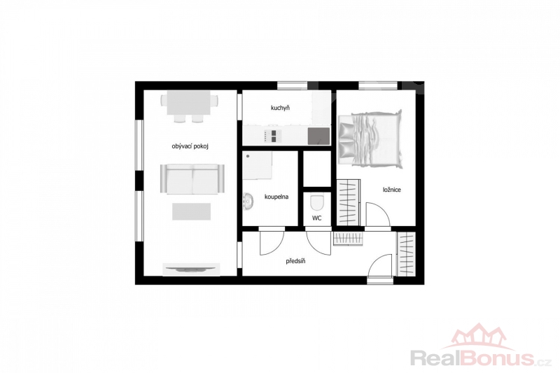 V obývacím pokoji je základní nábytek (stěna, stůl, židle), na obývací pokoj navazuje kuchyň s vlastním oknem, je vybavená plynovým sporákem s elektrickou troubou, digestoří, MW a lednicí s mrazákem, i myčkou.