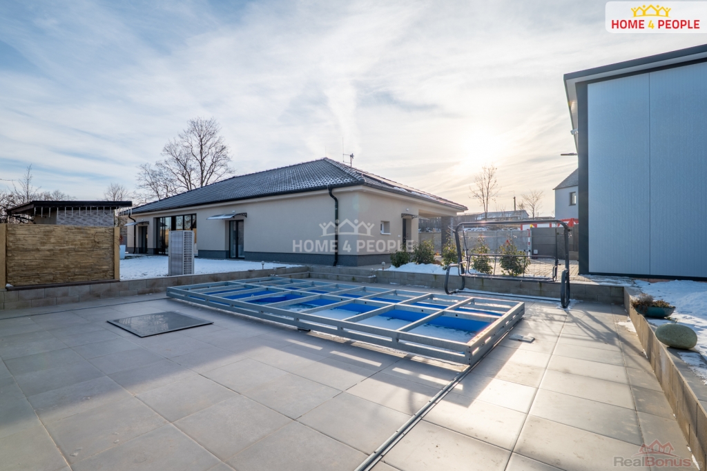 Prostorná a bezbariérová stavba v dispozici 4+kk a výměře 166 m vyniká promyšleným záměrem, kvalitními materiály i zpracováním a využitím chytrých technologií, které zajišťují pohodlný a úsporný provoz domácnosti. Vzdušné a světlé interiéry s dostatkem místa zahrnují hlavní pokoj s kuchyní a komorou, 2 pokoje, prosklenou zimní zahradu, koupelnu, šatnu, technickou místnost. Je zde i varianta přístavby pokoje. Topení podlahové, v každém pokoji i klimatizace.