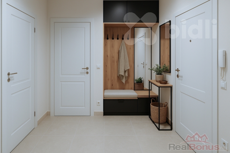 Byt je s kompletně vybavenou koupelnou ve standardním provedení, interiérovými dveřmi, přípravou na kuchyňskou linku a protipožárními vstupními dveřmi.