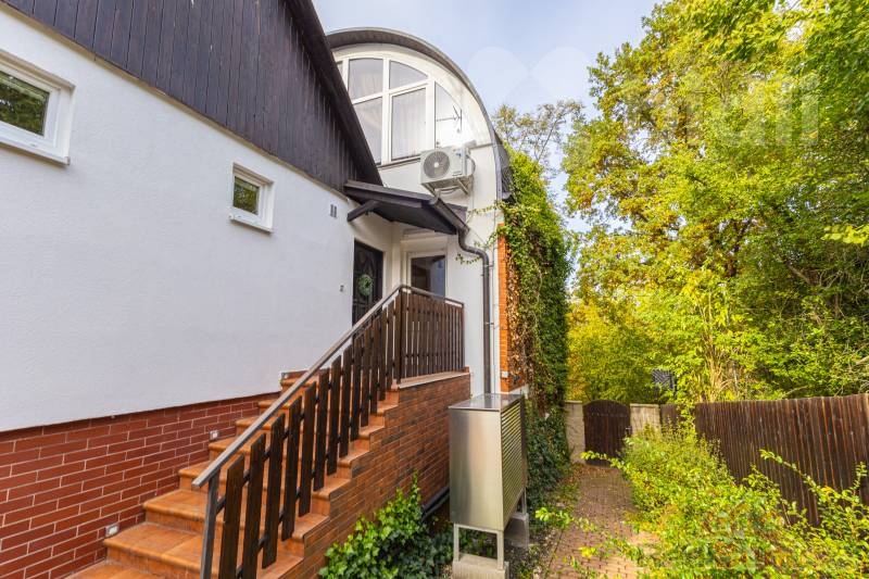 V suterénu domu je dvougaráž, sauna, velká pracovna s vlastním zázemím, samostatným vchodem, terasou, předzahrádkou a vlastním vstupem z ulice, která se dá využít k podnikání.