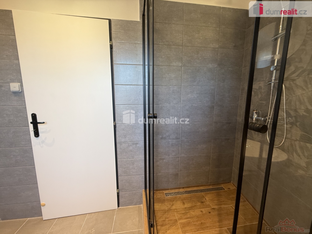 Koupelna s WC nabízí prostorný sprchový kout s inteligentně řešeným osvětlením, moderní umyvadlo, výkonné odvětrání a prostor pro umístění pračky.