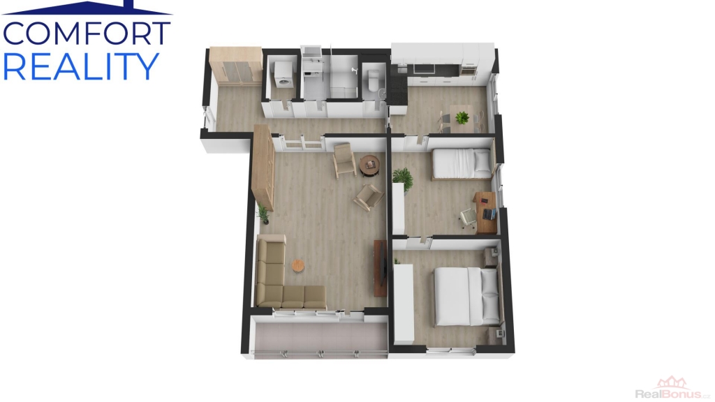 Samotný byt prošel v roce 2021 komplexní a vkusnou rekonstrukcí. V rámci modernizace došlo k výměně veškerých rozvodů vody, odpadů a elektroinstalace včetně nového rozvaděče. Byt disponuje novými štukovými omítkami, stropními SDK podhledy a novými interiérovými dveřmi. Promyšlené dispoziční řešení zahrnuje velkou vstupní předsíň a navazující chodbu, odkud jsou vstupy do praktické komory (lze umístit pračku, sušičku), koupelny, samostatného WC, obývacího pokoje a kuchyně.