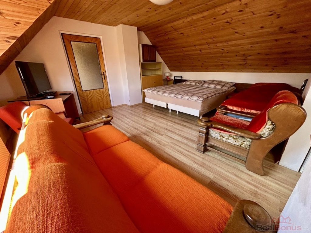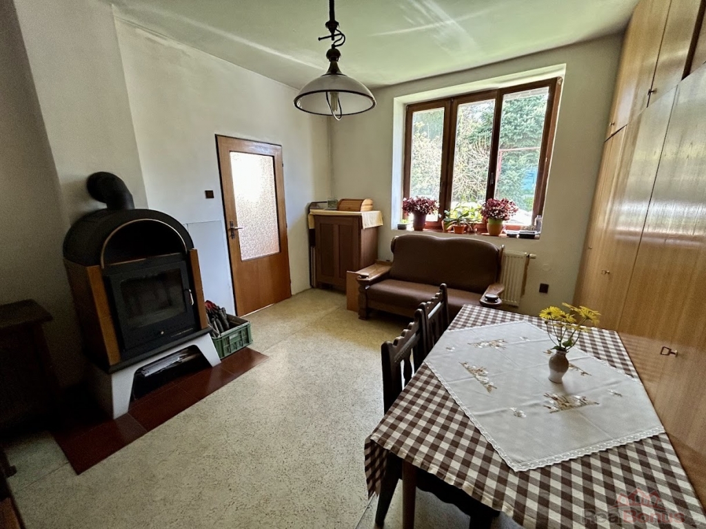 Celková rozloha domu je cca 110 m. V přízemí je veranda a prostorná vstupní hala, kterou vstoupíte do kuchyňské a jídelní části. Dále je zde obývací místnost s krbovými kamny a koupelna s toaletou. Po dřevěných schodech vyjdete do druhého podlaží, kde se nachází dva průchozí pokoje, které je možno spojit do jedné velké místnosti. Díky zavedení vody i do vrchního patra je zde příprava na vybudování další koupelny a toalety.