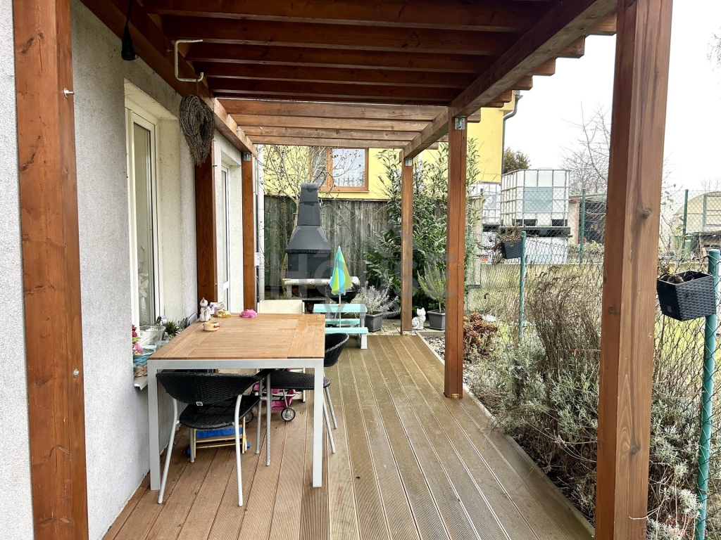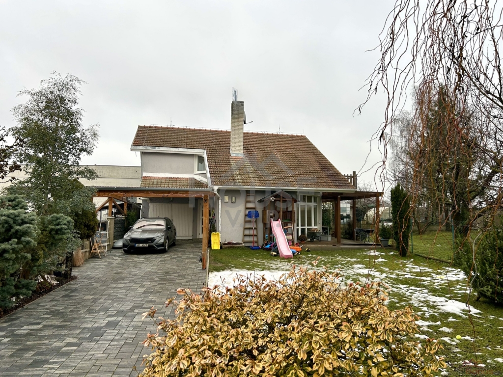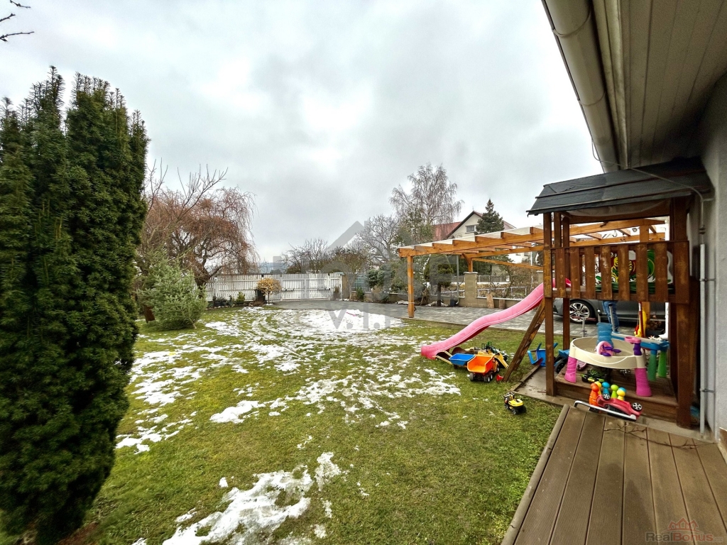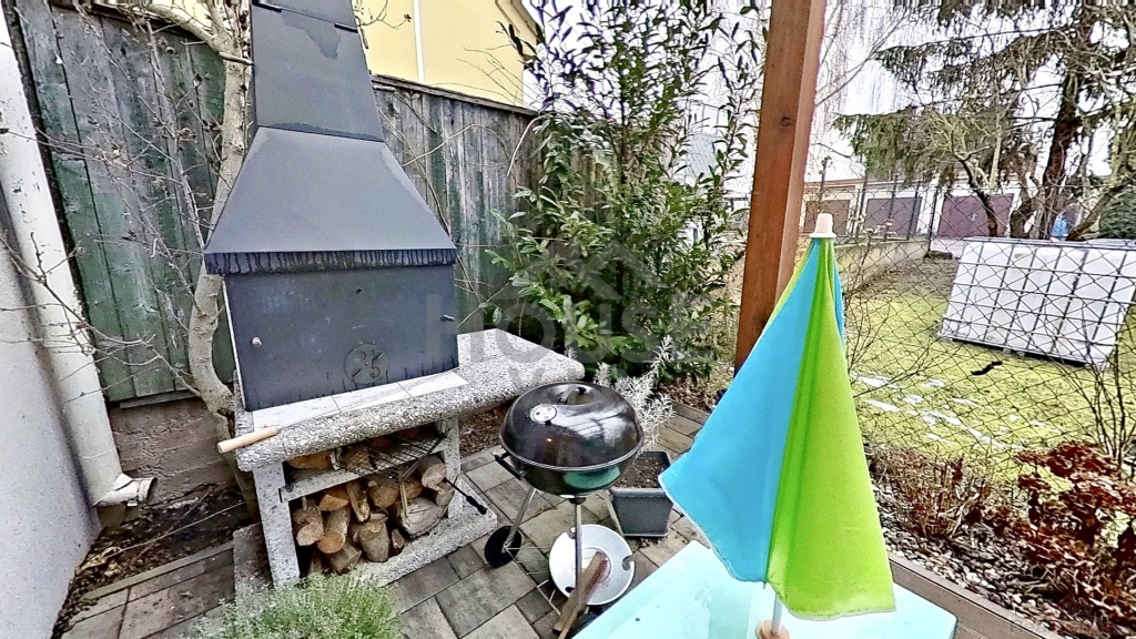 Rovinatá, slunná zahrada je nenáročná na údržbu, nabízí terasu s pergolou, venkovní krb, vzrostlé stromy i prostor pro relaxaci. Parkování je možné v garáži, pod krytým stáním i na vlastním pozemku, další stání je přímo před domem.