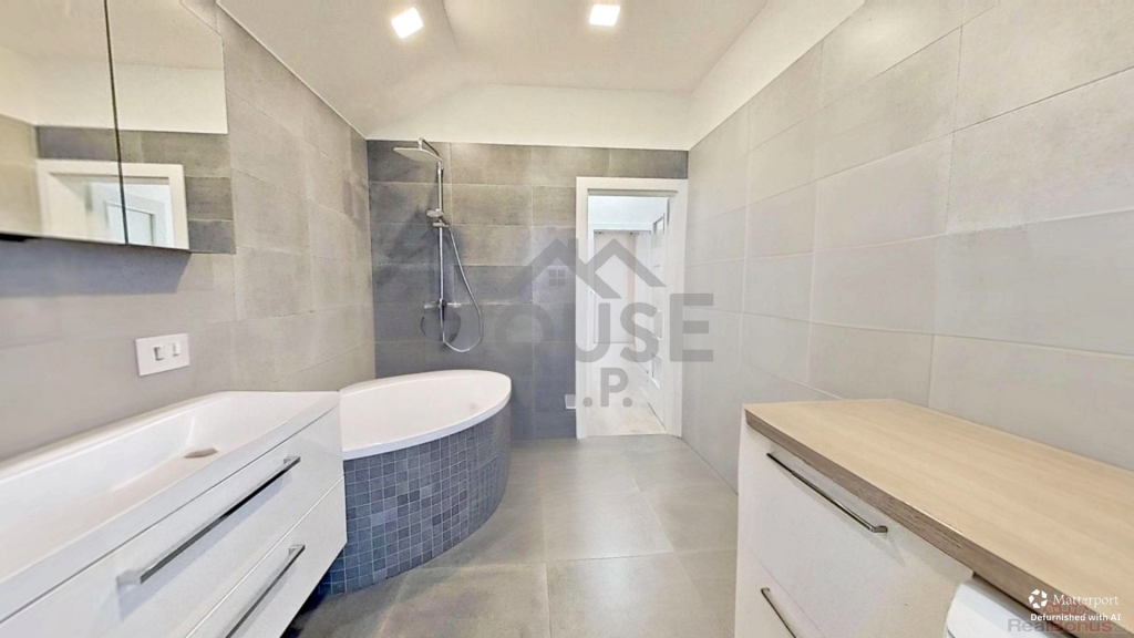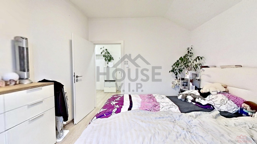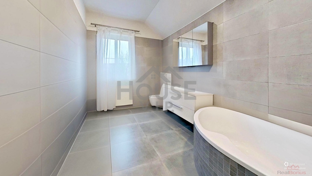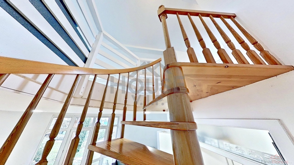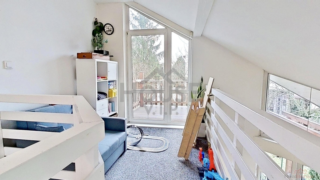 V patře je galerie s relaxační zónou, pracovna, dětský pokoj, ložnice, šatna, prostorná koupelna s vanou a vstup na balkon o ploše 6,67 m2 orientovaný na jih.