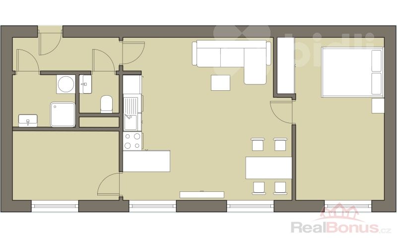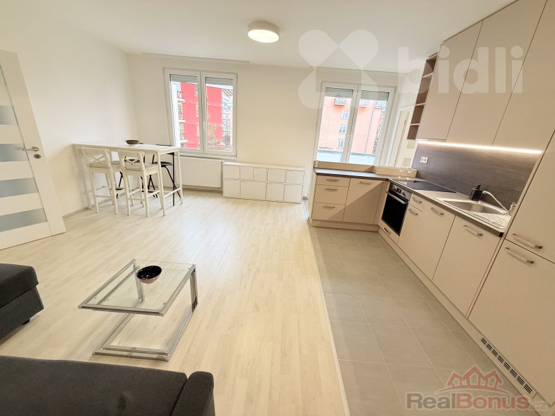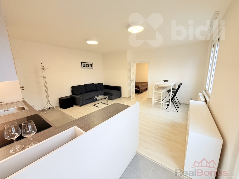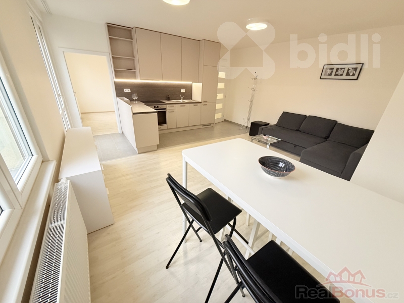 Byt tvoří prostorný obývací pokoj s kuchyňským koutem vybaveným moderní kuchyňskou linkou na míru, která je dominantou celého prostoru. Součástí je pohodlný gauč, jídelní stůl se čtyřmi židlemi a dostatek úložného prostoru.