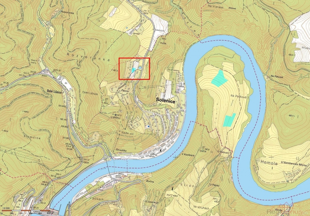 Pozemek se nachází v klidné části obce Solenice, poblíž Orlické přehrady (cca 1 km od hráze), která nabízí možnosti rekreace a vodních sportů. Obec poskytuje základní občanskou vybavenost, okresní město Příbram je vzdáleno cca 17 km. Lokalita kombinuje přírodní prostředí s dostupností služeb a dopravní dostupností.