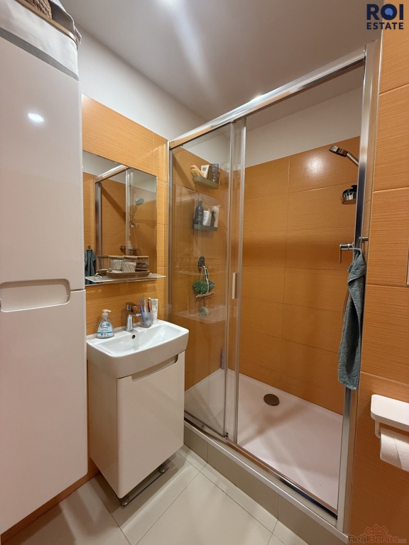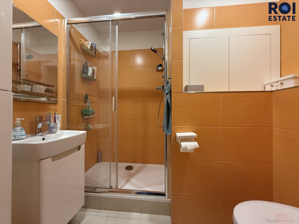 Při vchodu do bytu se ocitnete v prostorné předsíni, která Vás provede celým bytem. Nutno podotknout, že je zde i prostor, který můžete využít jako odkladný prostor. Z předsíně se nejprve podíváme do nově zrekonstruované koupelny, která zaujme vkusným designem a prostorným sprchovým koutem. Potěší také rohové skříňky, kam si můžete odložit co je zrovna potřeba - v koupelně se také nachází WC.