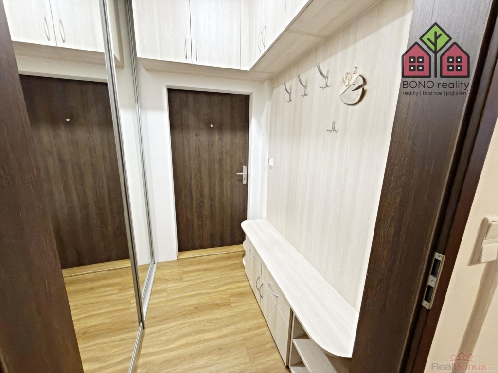 Vstup do bytové jednotky tvoří chodba s přístupem do kuchyně, která je dále průchozí do pokoje a do koupelny. V kuchyni je moderní linka s vestavěnými spotřebiči a jídelní stůl se židlemi, který může sloužit i jako počítačový koutek. Ve velkém pokoji, který Vám bude ale sloužit i jako část spací, je umístěna sedací souprava, dvoulůžko či šatní skříň. V koupelně je k dispozici vana se zástěnou, umyvadlo, společná toaleta s oknem a posuvnými dveřmi a oddělený a uzavíratelný prostor s automatickou pračkou. Okna jsou plastová a na podlaze je položena dlažba nebo plovoucí podlaha. V chodbě jsou vestavěné úložné prostory se zrcadlovou částí a věšákovou stěnou. K dispozici je menší zděný sklípek o výměře 3,6 m2.