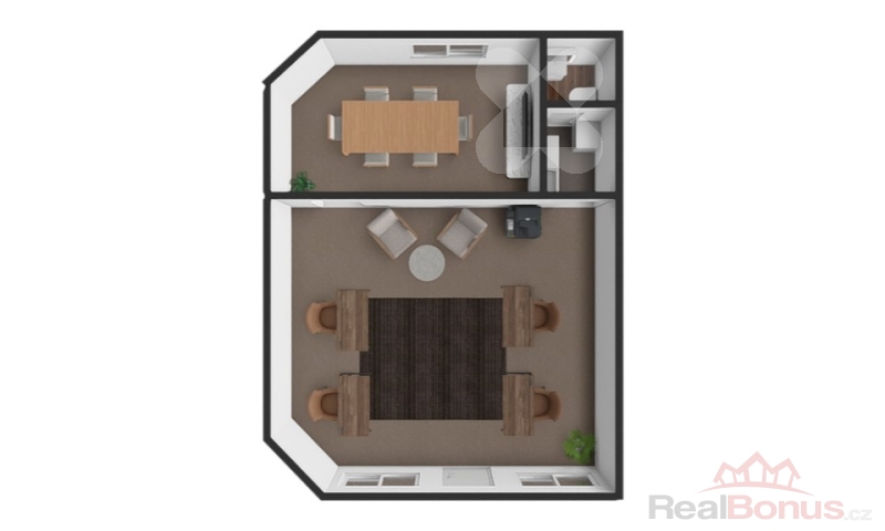 Dispozice prostoru tvoří jedna větší místnost, jedna menší a vlastní sociální zázemí. Jednotka je situována ve 2. nadzemním podlaží budovy určené ke komerčním účelům.