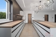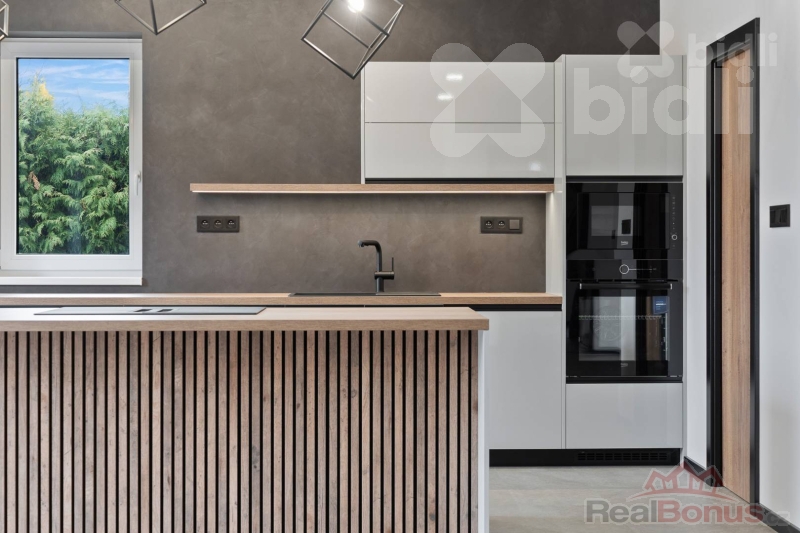 Kuchyňská linka je vyrobena na míru a osazena kvalitními spotřebiči (např. Franke - varná deska s integrovaným odsáváním). Velkou výhodou je samostatná spíž přístupná přímo z kuchyně.