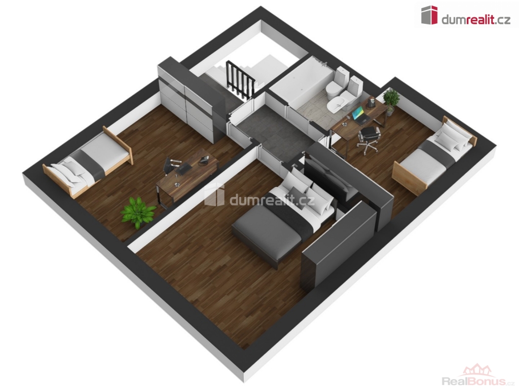 Po schodišti, pod kterým je malý sklípek, se pak dostaneme do vestavěného podkroví se třemi ložnicemi o 14,4 m, 20,8 m a 11,8 m. Z posledně uvedené lze udělat kuchyň, díky přivedeným rozvodům vody a odpadu. Samozřejmě je zde i další koupelna s vanou, umyvadlem a WC.
