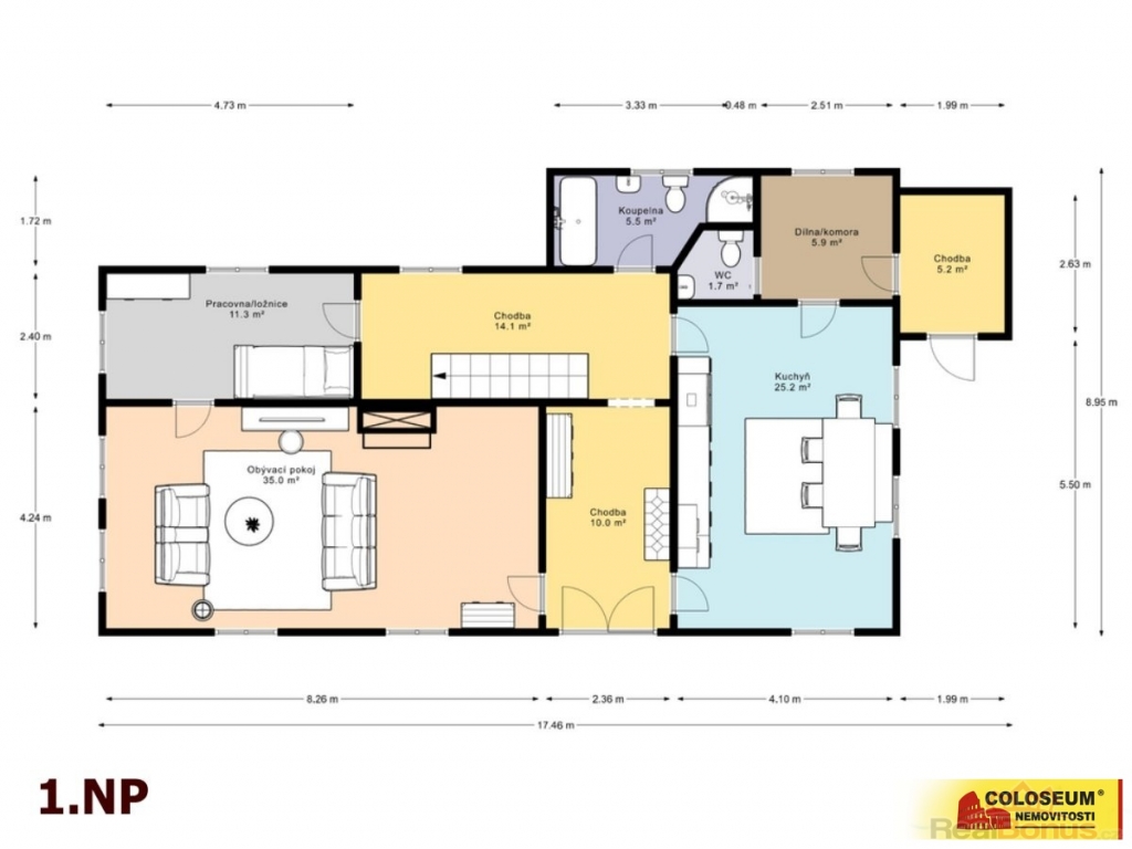 V 1. NP se nachází 2+1 s kuchyní vybavenou mramorovou pracovní deskou, sklokeramickou varnou deskou a zabudovanou myčkou nádobí. Dominantou obývacího pokoje jsou originální dánská mramorová kamna značky L. Lange & Co., která pohodlně vytopí celý dům. Dodají bytu nejen teplo domova, ale i romantickou atmosféru. Vstupní chodbu navíc zdobí podlaha z pravého Jesenického mramoru.