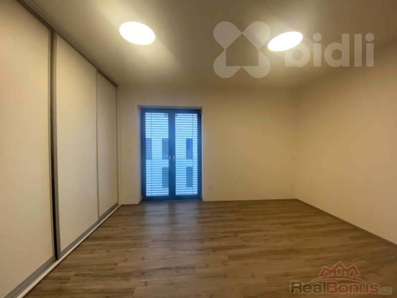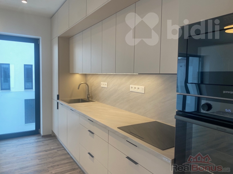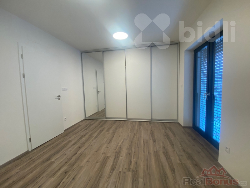 Součástí kuchyňské linky jsou vestavěné spotřebiče( lednice, myčka, indukční varná deska, trouba, MWT), v ložnici se nachází velká šatní skříň.
