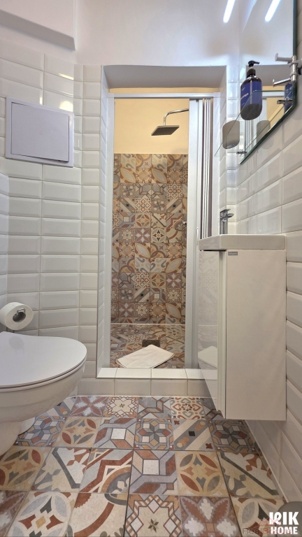 - Koupelna a WC: Koupelna se sprchovým koutem a toaletou, designové obklady.