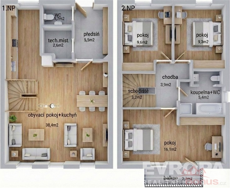 1. NP: Dominuje zde světlý obývací pokoj s kuchyňským koutem (38,4 m), samostatné WC a praktická technická místnost.