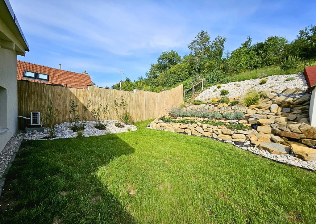 Nechybí praktický domek na nářadí či kola, ohniště s výhledem do zeleně a dětské pirátské hřiště.