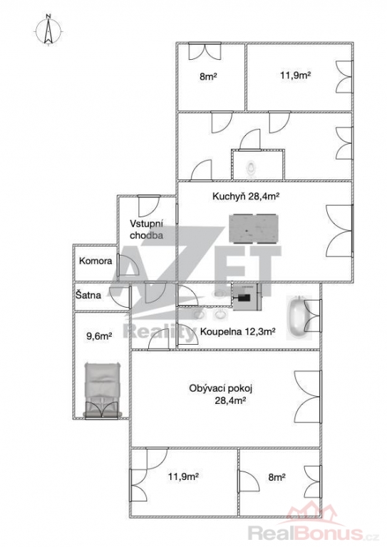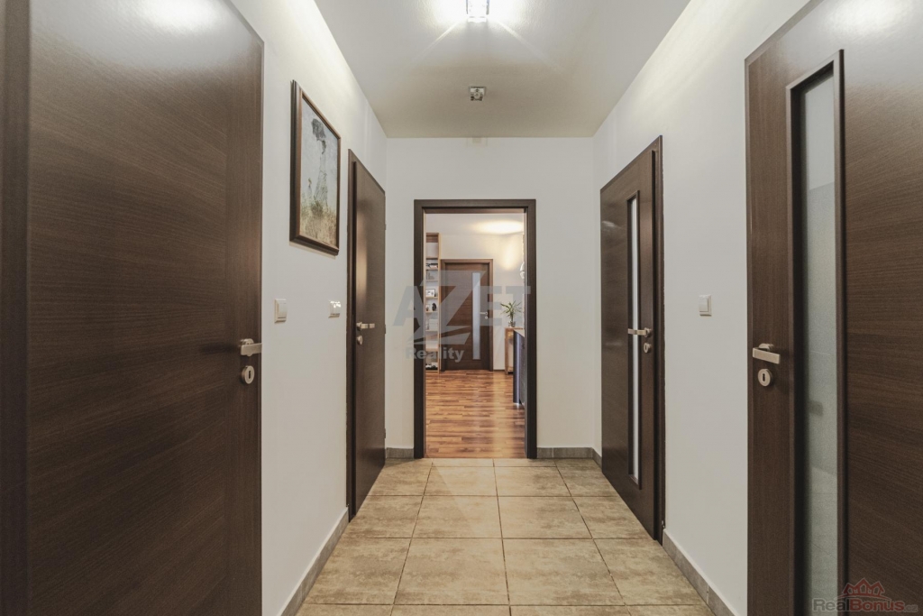 Dispozice bytu je promyšlená a nabízí dostatek soukromí i komfortu v podobě prostorné koupelny s oknem vedle vany a sprchovým koutem, dvě samostatné toalety, 2x komora/šatník a šest pokojů.