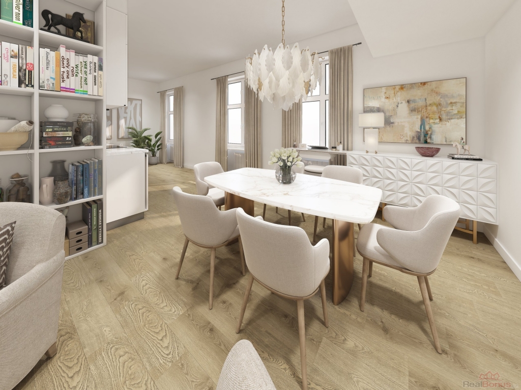 Velkou předností bytu jsou vysoké stropy o výšce 3,28 m, které spolu s velkými okny dodávají interiéru vzdušnost a příjemnou atmosféru typickou pro městské bydlení v historických domech.