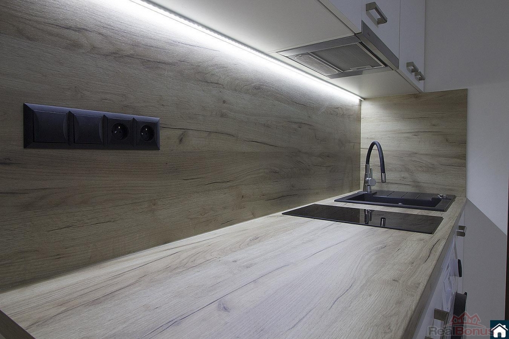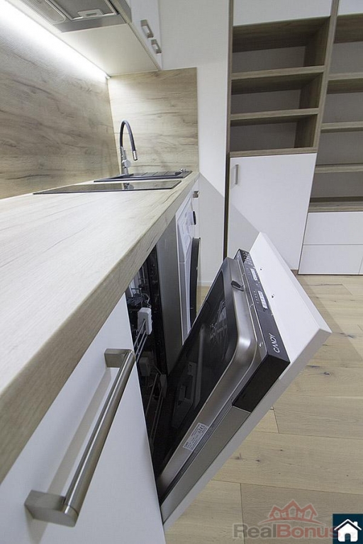 Byt má luxusní vybavení - kuchyňská linka s varnou deskou, myčkou, lednicí a pračkou se sušičkou.