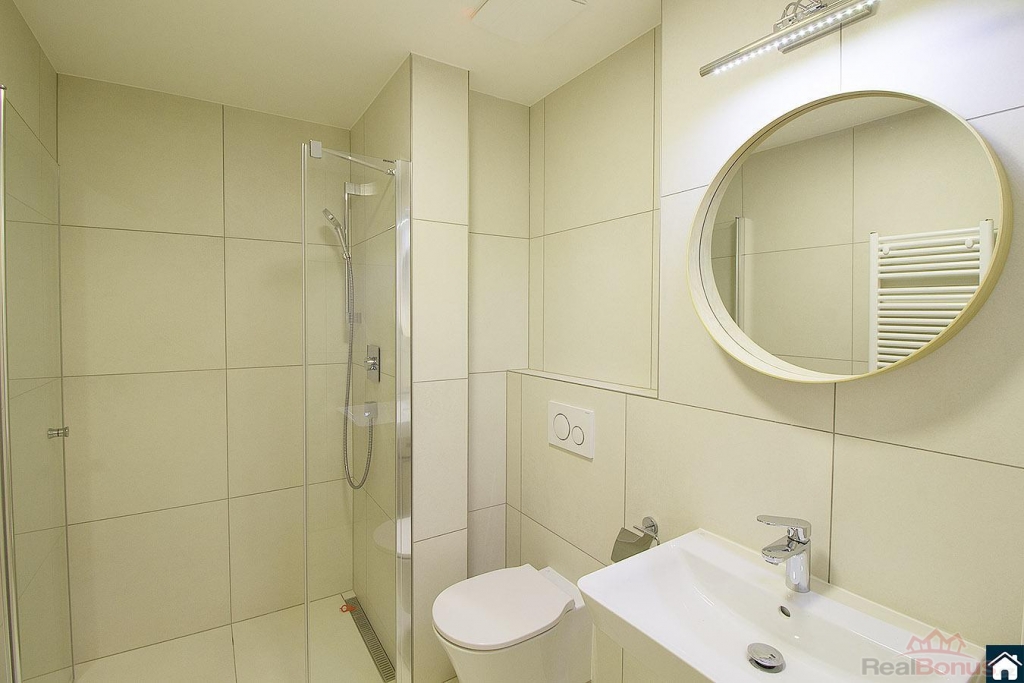 Koupelna je vybavena prostorným sprchovým koutem a WC je společné.