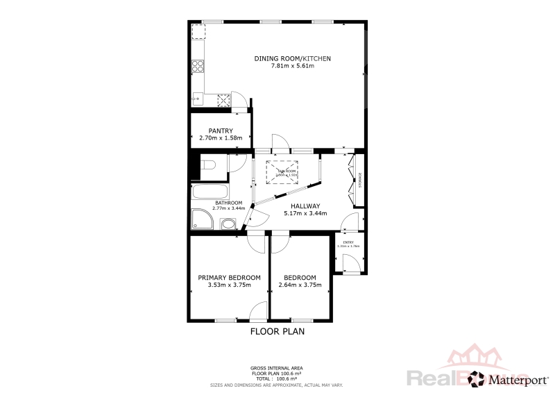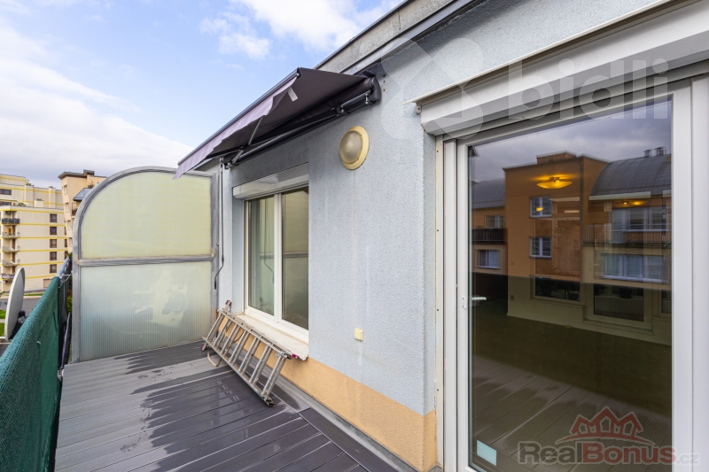 Byt je umístěn v 5. patře, hned naproti výtahu, v moderním domě z roku 2000. Celková výměra je 104,25 m2, z toho 90,65 m2 je užitná plocha uvnitř bytu a 13,6 m2 mají terasy.
