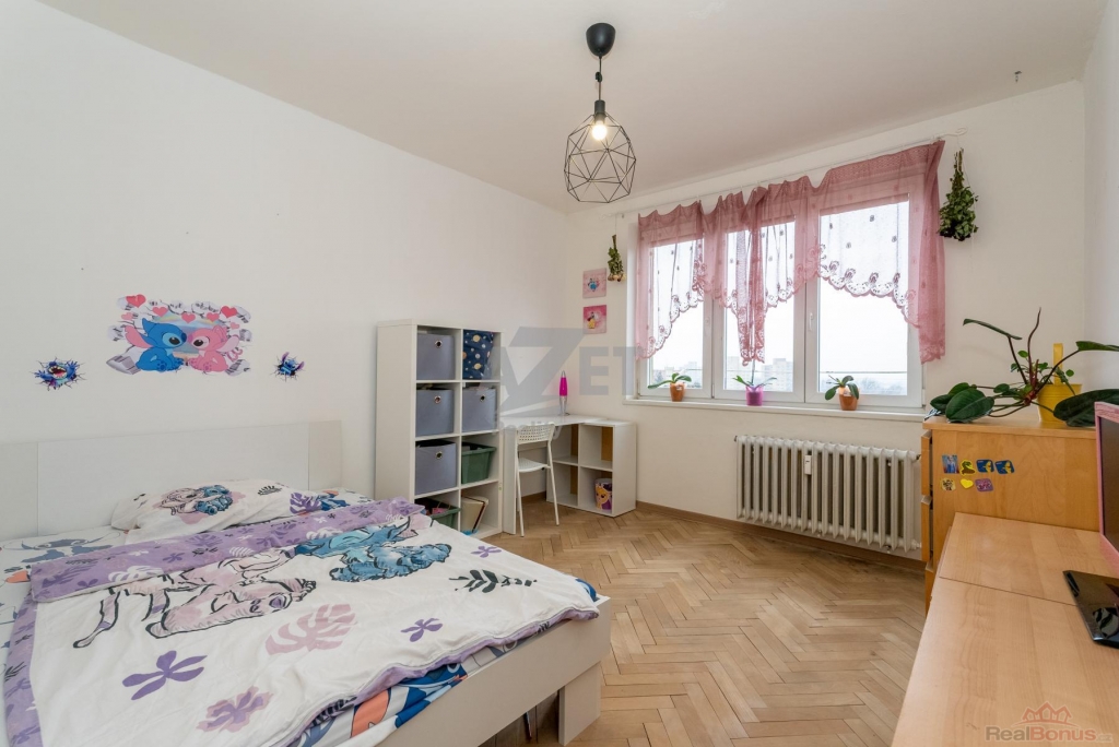 Byt nabízí zajímavý potenciál pro úpravu dispozice například vybudování šatny nebo pracovního koutku v obývacím pokoji.