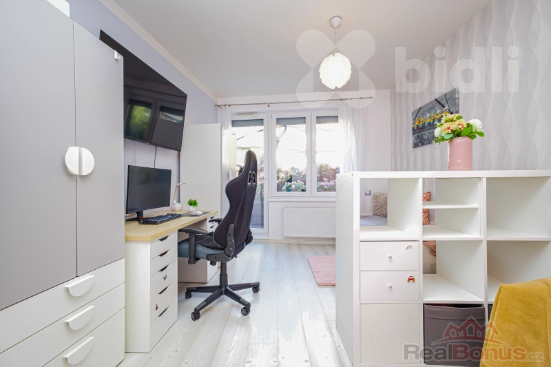 Dvě ložnice (16,1 a 11,3m2) orientované na sever se vstupem z jedné z nich na terasu o velikosti 5 m2 a na 14 m2 předzahrádku směřující do klidného vnitrobloku se zelení, což zajišťuje stabilní teplotu a klidný spánek i během letních měsíců.