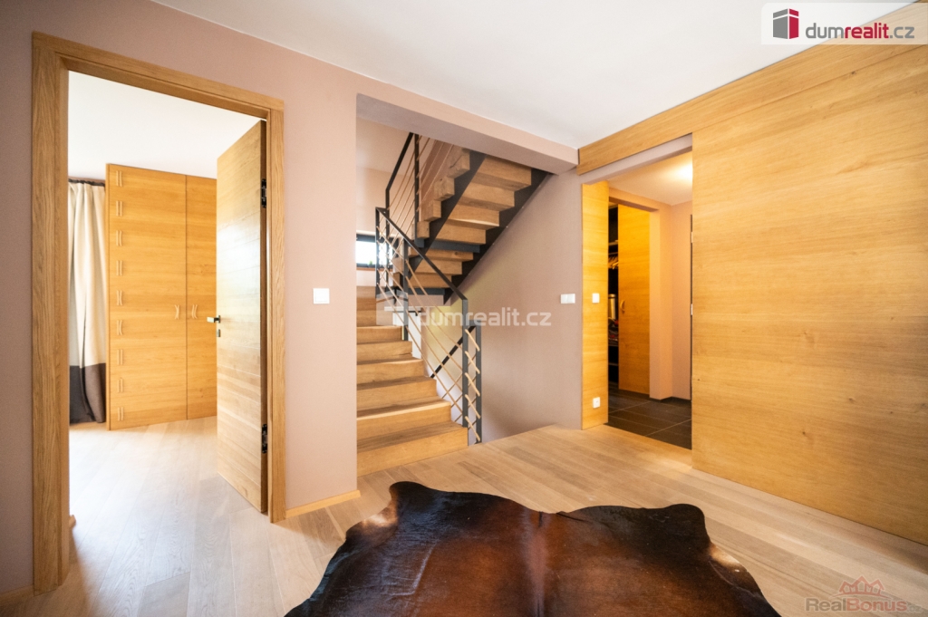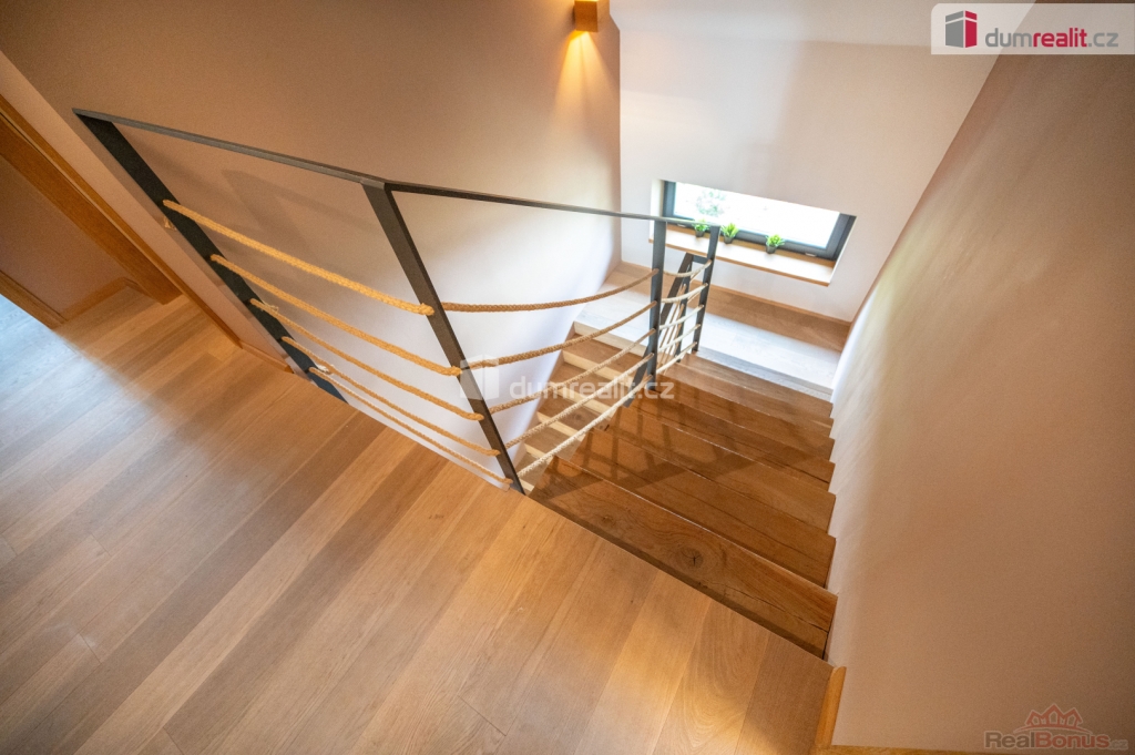 Dům je propojen schodištěm s nášlapy z masivu na ocelové konstrukci se zábradlím s lanovou výplní.