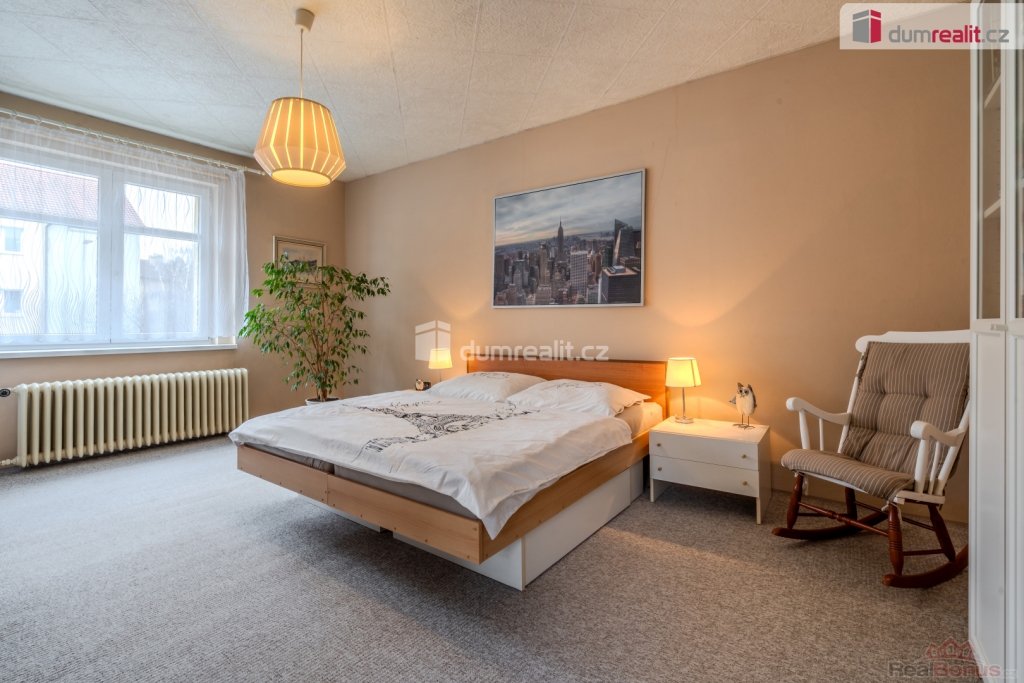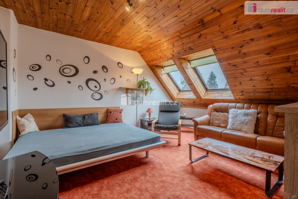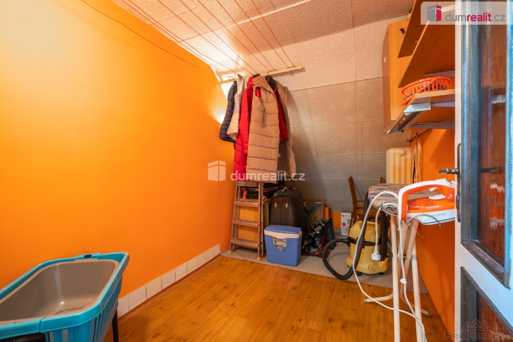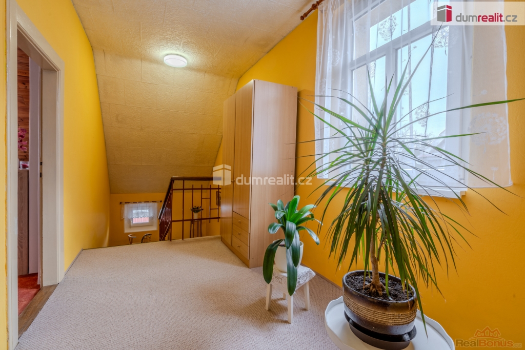 Po schodišti ze vstupní haly se dostaneme do patra, kde jsou dvě ložnice a jedna malá místnost, momentálně bez okna ( lze pořešit střešním oknem ) sloužící jako šatna, místnost na žehlení či úložný prostor.