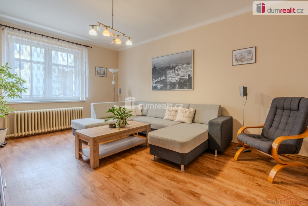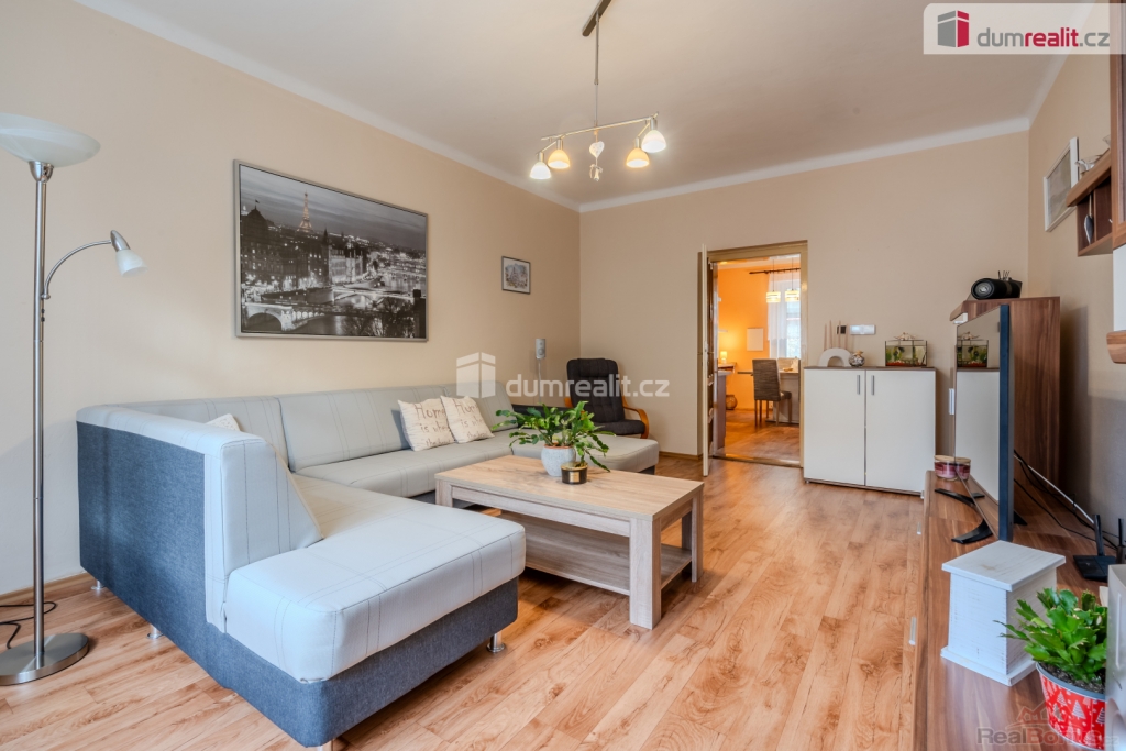 Obývací pokoj je umístěný vedle kuchyně s pohledem do ulice a může zůstat pro nové majitele i s nábytkem.