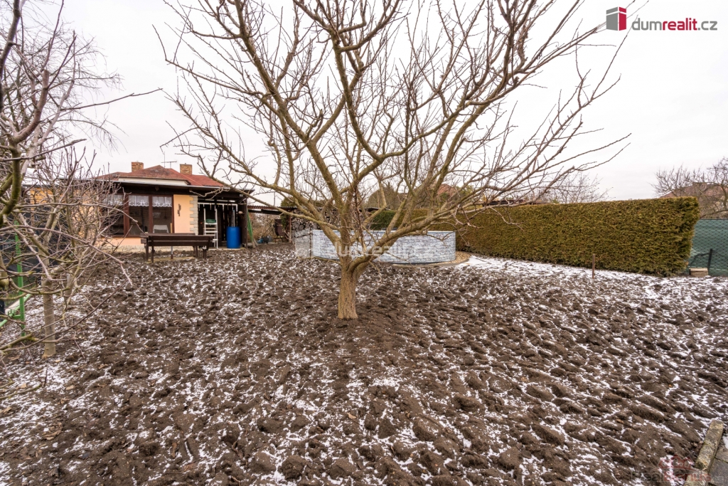 Na zahradu se dostaneme po betonovém schodišti za domem. Zahrada o rozloze 267 m je dostačující pro stávající nadzemní bazén, prostor pro pěstování, stromky i venkovní domek, který slouží jako letní kuchyňka.