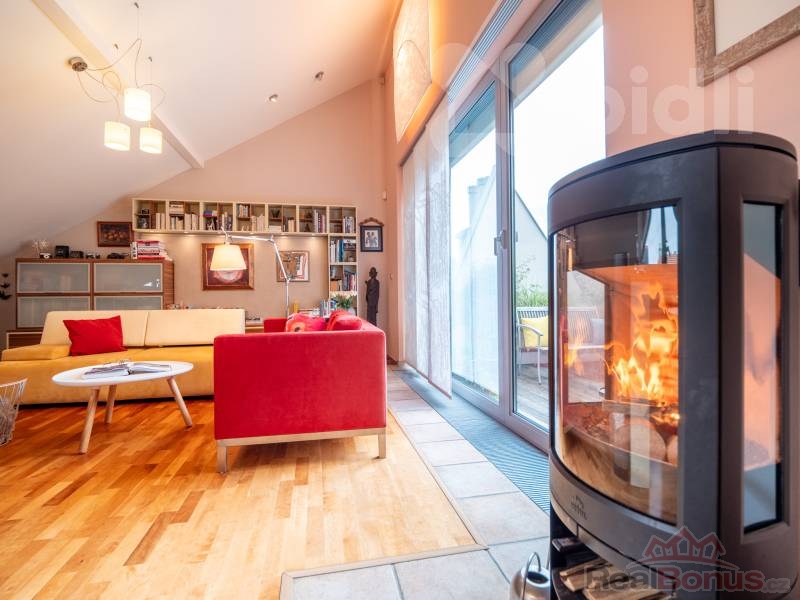 Velkorysý obývací prostor propojený s elegantní kuchyní a jídelnou. Večer si můžete zpříjemnit posezením u francouzského okna s praskajícím ohněm v krbových kamnech.