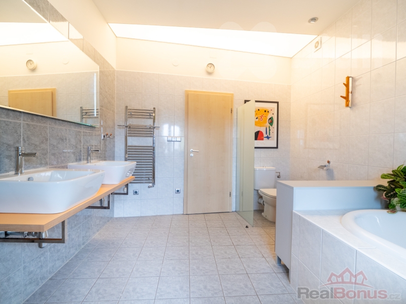Hlavní ložnice s vlastní šatnou a další dvě prostorné ložnice (pokoj, pracovna) poskytují komfort pro rodinu i hosty.