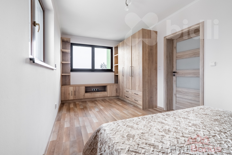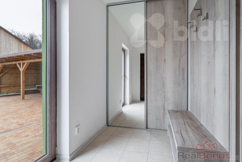 Uvnitř je to promyšlené pro normální život. Dvě koupelny jsou luxus: v přízemí toaleta, topný žebřík, umyvadlo, pračka, sprchový kout - rychle, pohodlně, prakticky. V patře koupelna s vanou a toaletou - večerní relax a pohoda. V přízemí potěší předokenní rolety, které udělají soukromí i příjemný stín v létě. Komfort doplňuje podlahové vytápění - žádné radiátory, jen čistý design a teplo tam, kde má být. O úsporný provoz se stará tepelné čerpadlo, elegantně schované v chodbě, takže nikde nepřekáží a neruší. Okolí domu je pod kamerovým systémem.
