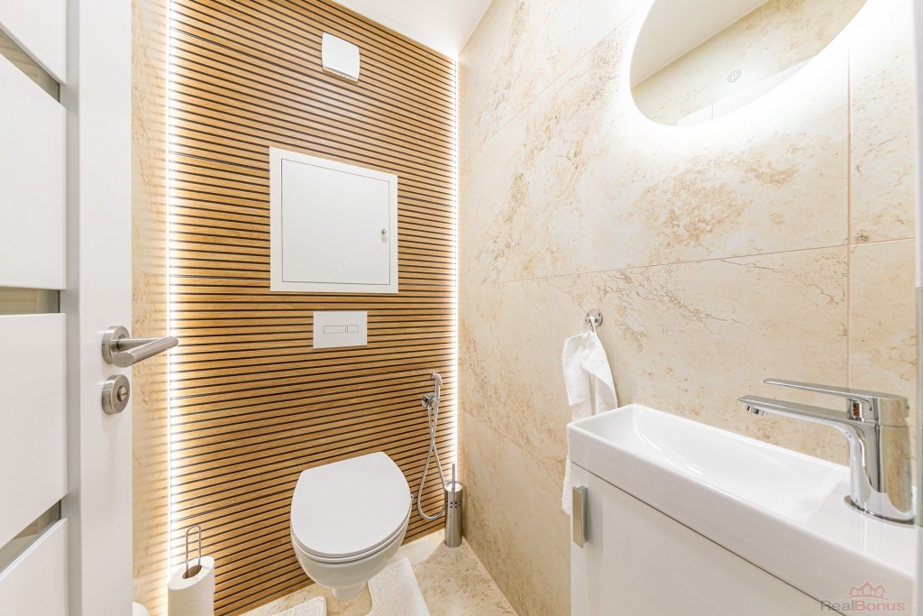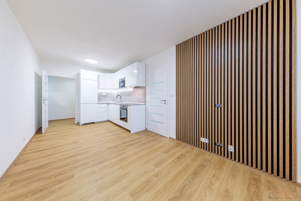 Nová kuchyňská linka včetně vestavěných spotřebičů (myčka, horkovzdušná trouba včetně indukční varné desky, lednice, digestoř, mikrovlnná trouba), LED osvětlení pracovní desky, nerezový kuchyňský dřez, dřezová stojánková baterie s elastickým ramenem.