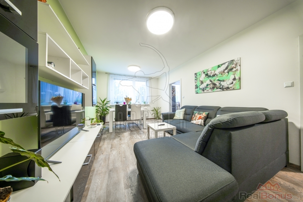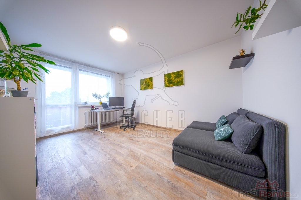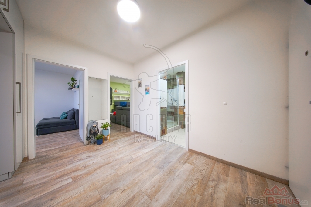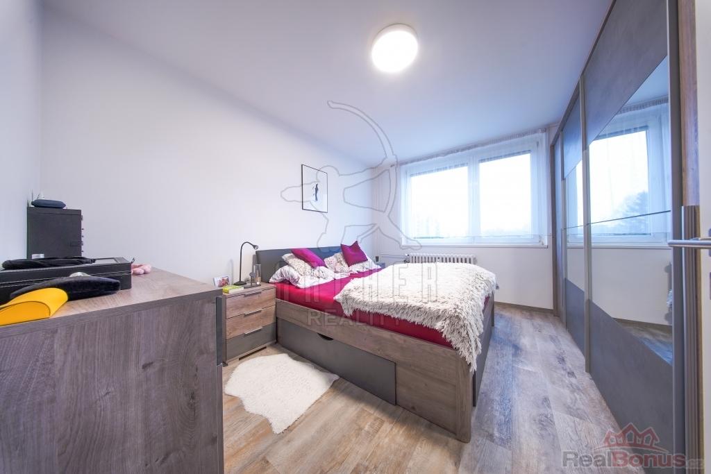 Pokoje jsou otočeny k severovýchodu, směrem k národní přírodní památce Radouč. Větší z pokojů má přístup na 4m2 lodžii s pěkným výhledem do přírody. V předsíni jsou instalovány nové velké vestavné skříně až do stropu. Koupelna s WC a místem na pračku i sušičku má nadstandardně prostorný sprchový kout.